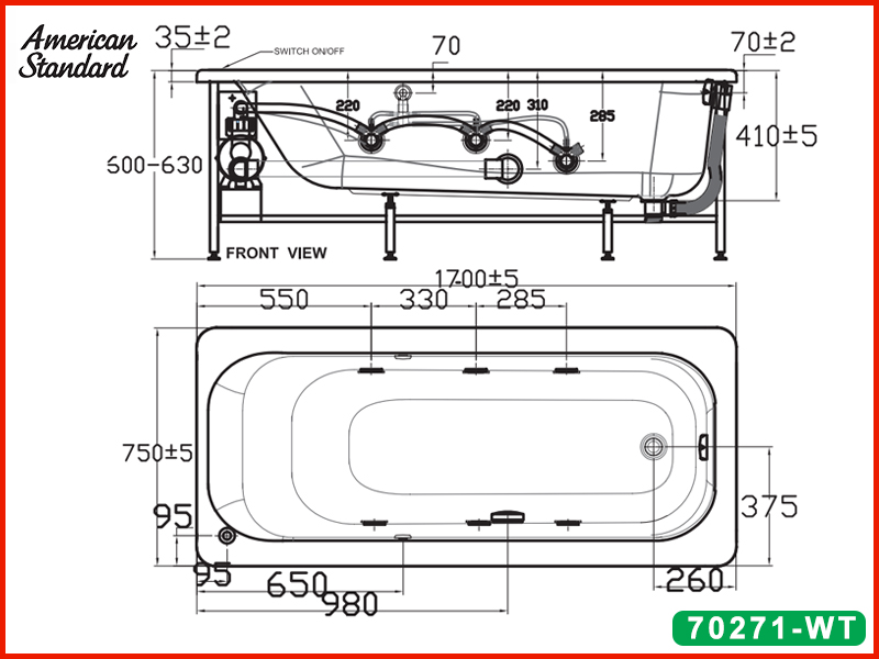 Bản vẽ kỹ thuật bồn tắm thủy lực American Standard 70271-WT