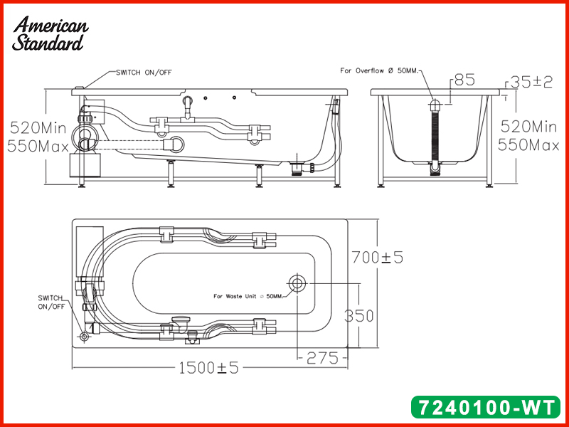 Bản vẽ kỹ thuật bồn tắm thủy lực American Standard 7240100-WT
