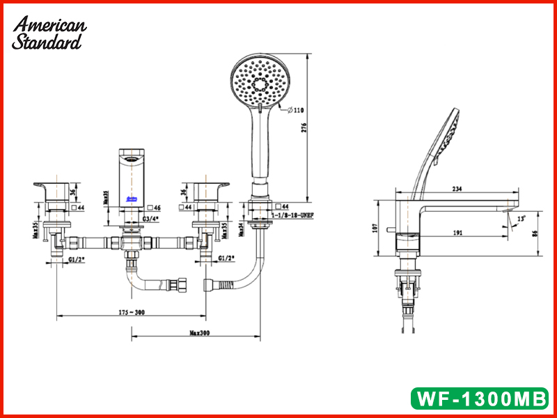 Bản vẽ kỹ thuật vòi bồn tắm gắn bồn American Standard WF-1300MB