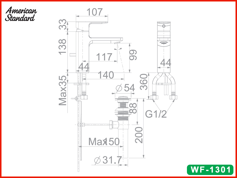 Bản vẽ kỹ thuật vòi lavabo nóng lạnh American Standard WF-1301