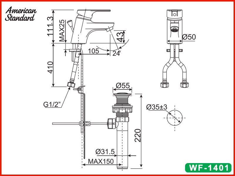 Bản vẽ kỹ thuật vòi lavabo nóng lạnh American Standard WF-1401