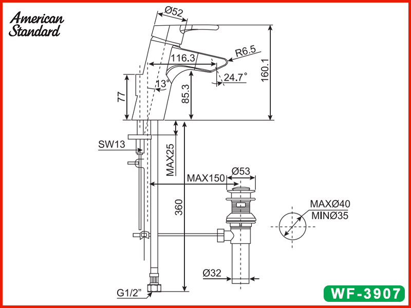 Bản vẽ kỹ thuật vòi lavabo nóng lạnh American Standard WF-3907