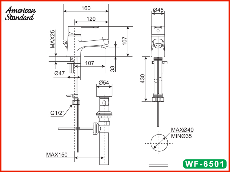 Bản vẽ kỹ thuật vòi lavabo nóng lạnh American Standard WF-6501